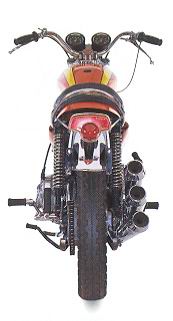 jako bylo sedlo a nádrž z jednoho kusu, nápadný trojitý výfukový