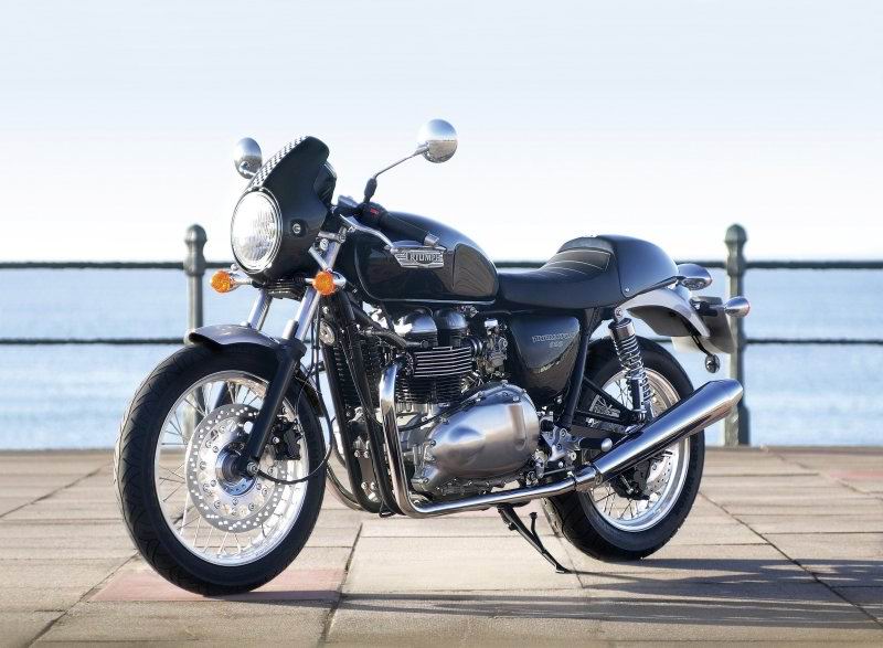 Návrat klasiky se žádá, tak proč zákazníkům nevyhovět. Motocykl Triumph Thruxton je pojmenován podle legendárního závodního okruhu na kterém, dříve slavně vítězili závodní motocykly značky Triumphy Bonneville. Letošní novinka, stroj Triumph Thruxton v sobě ukrývá mohutný řadový vzduchem chlazený dvouválec se zdvihovým objemem 865ccm a výkonem 70 HP, v jeho hlavách válců kmitá při maximálních otáčkách 7250rmp osm hbitých ventilů, čtyři z nich vpouštějí přes dva nové karburátory výbušnou směs do objemných válců a druhé čtyři vypouštějí již spálenou směs do krásných megafon-styl tlumičů, ze kterých se valí strhující dunivý zvuk závodního stroje z konce šedesátých let. Tento pozoruhodný motocykl za sucha vážící 451lbs(205kg), kupředu pohání motor se solidním kroutícím momentem 72Nm/5750rmp s navazující pěti rychlostní převodovkou, která má za úkol plně využít potencionálu motoru pro svižnou sportovní jízdu a občas dohnat ručičku tachometru až na samý konec ciferníku (ciferník nebyl dosud zveřejněn), nicméně někdy je třeba taky tak rychlý motocykl trochu zpomalit a prohlídnout si i okolní míhající se krajinu. O to se starají vepředu i vzadu velice účinné jednokotoučové brzdy s dvou pístkovými třmeny. Na předním kole je průměr kotouče 320mm a na zadním 255mm. Celkový retro vzhled motocyklu podtrhují drátěná kola, s poměrně tenkými pneumatikami 100/90-18 ve předu a 130/80-18v zadu , kulaté chromované světlo, skloněná úzká řidítka sportovního stylu, mírně baculatá 16 litrová nádrž a nádherně tvarované sedlo s elegantním zakrývacím nehtíkem, které nám nedovolí sklouznout ze sedla při brutálním zrychlení takřka závodního stroje. Thruxton, to je vynímečný stroj pro dnešní uspěchanou dobu.